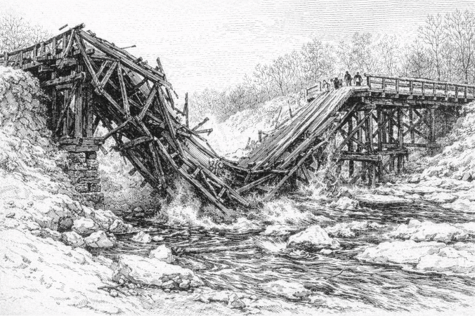 The bridge, believed to have been constructed more than thirty years ago and long familiar to teamsters and travelers alike, gave way after several days of strain from deep snow and ice. No injuries were reported at the time of the collapse, as mercifully, the structure failed during the night when traffic was light.