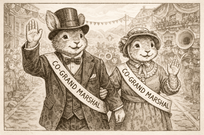 Banners lifted in the breeze without tangling. The brass quartet maintained tempo without wavering. The Square held steady in expectant quiet as Bartholomew “Barty” Burrows, Presiding Rabbit in Chief for Seasonal Affairs, Celebrations, and Shenanigans, stepped forward onto the balcony overlooking Butterfield.