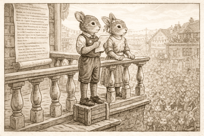 Miss Clover Thimblefoot, chosen to deliver the Official Oath of Upright Hopping, approached the balcony rail with composed determination. Though her whiskers trembled ever so slightly at first, she steadied herself — ears held admirably high — and spoke clearly into the bright morning air.