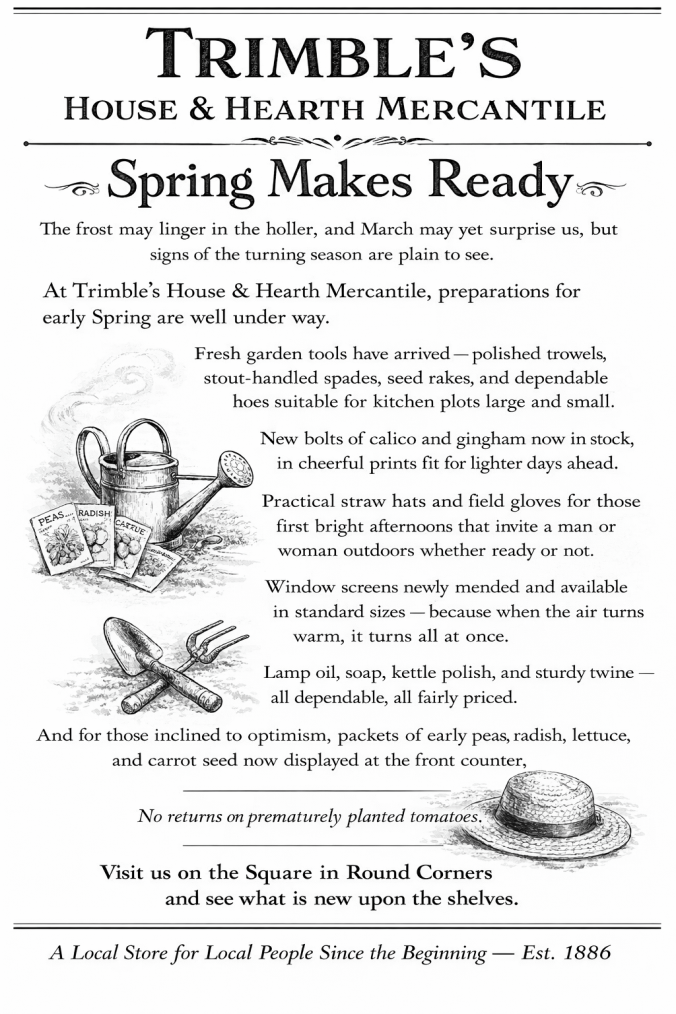 The Hearth & Holler Gazette is a work of fiction — a made-up paper from a made-up place, written in the spirit of an earlier time. Any resemblance to real towns, people, or events is entirely coincidental, though we do our best to make it feel otherwise.