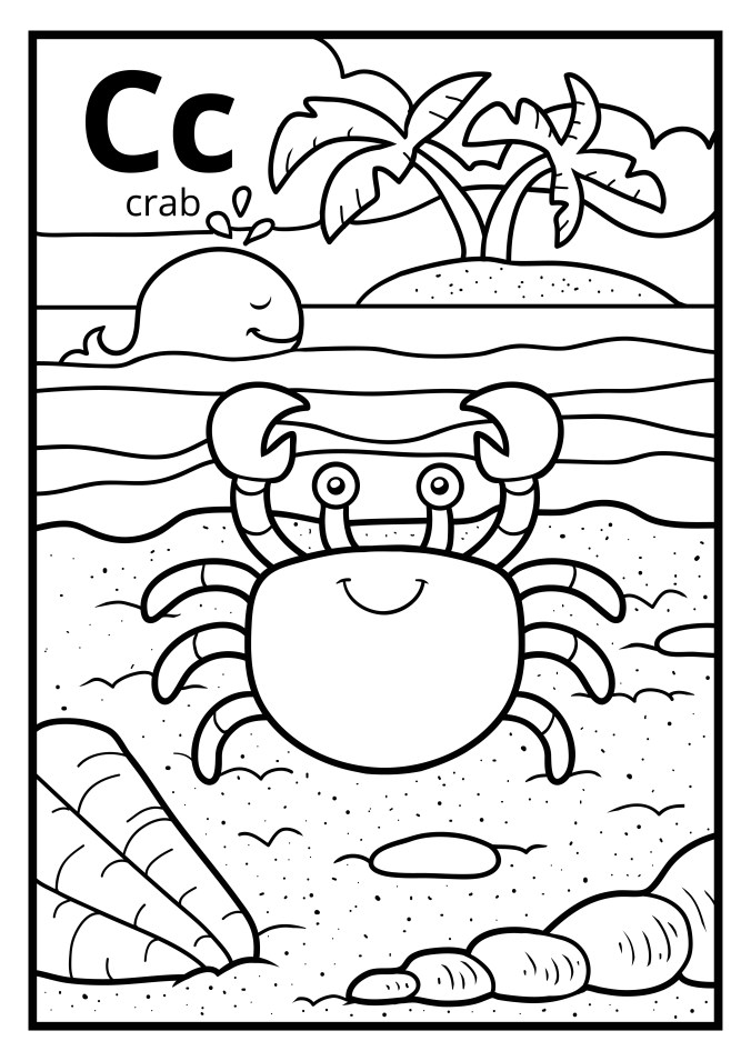 AN EXTRA BONUS — The letter “C” is for Crab, too. We always think about Crabs in the ocean. But Crabs can live on land, too, as long as they keep their gills moistened so they can breathe. And that is the main reason why we always see them either in the water or near the shore. This crab looks happy! What colors will you use to color this happy Crab and his Whale friend?